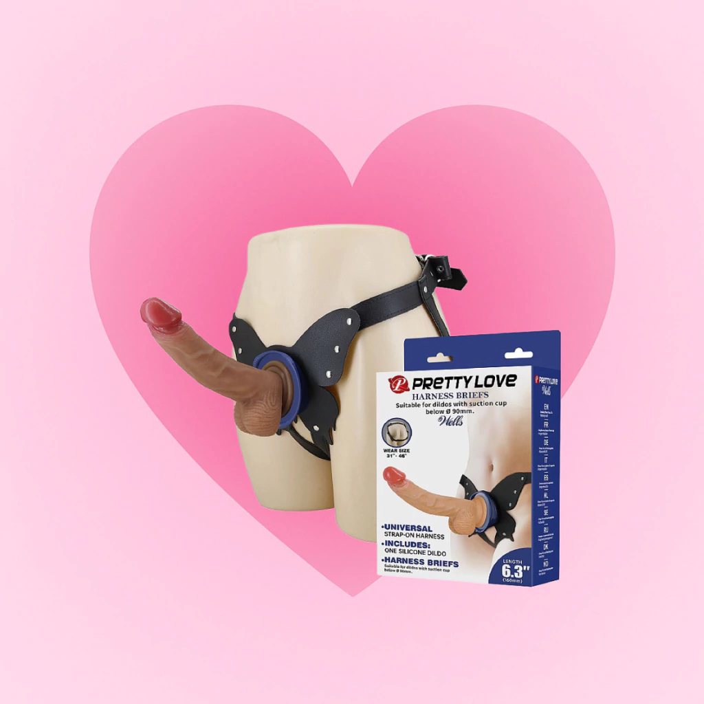 Cinta com prótese realística em formato de pênis com alça elástica que se adapta a qualquer grossura de perna e quadril.