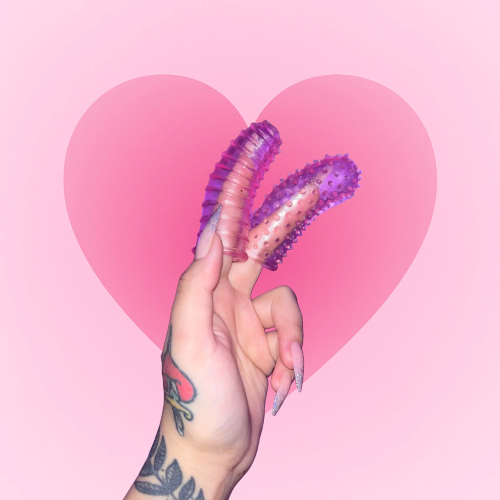Conjunto composto por 2 capas estimuladoras para dedos feitas de gel, uma com nódulos massageadores e outra com texturas aneladas, ambas com curva na ponta para estimular o ponto G. Super macias, resistentes e elásticas, cabem em qualquer dedo ou em pequeno vibrador. Torne sua massagem muito mais prazerosa!